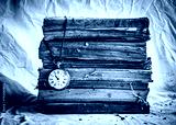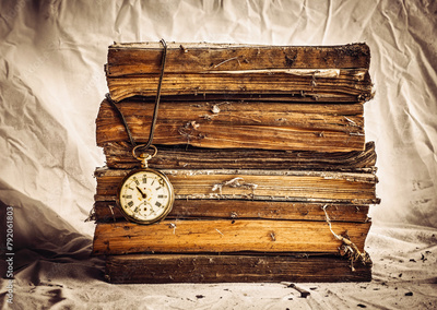 Pile of old dusty books with broken pocket watch on dirty white cloth.