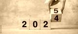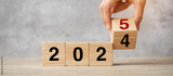 hand flipping block 2024 to 2025 text on table. Resolution, strategy, plan, goal, motivation, reboot, business and New Year holiday concepts