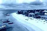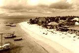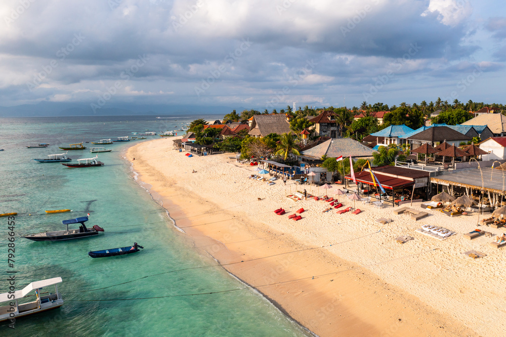 Nusa lembongan : Aerial drone view of tourists enjoy the Jungut Batu beach lined with new beach clubs and hotels in Nusa Lembongan in Bali in Indonesia in Southeast Asia.