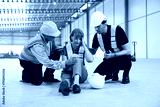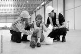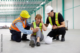senior worker fall down on the floor with hurting knee and coworker helping her in the factory