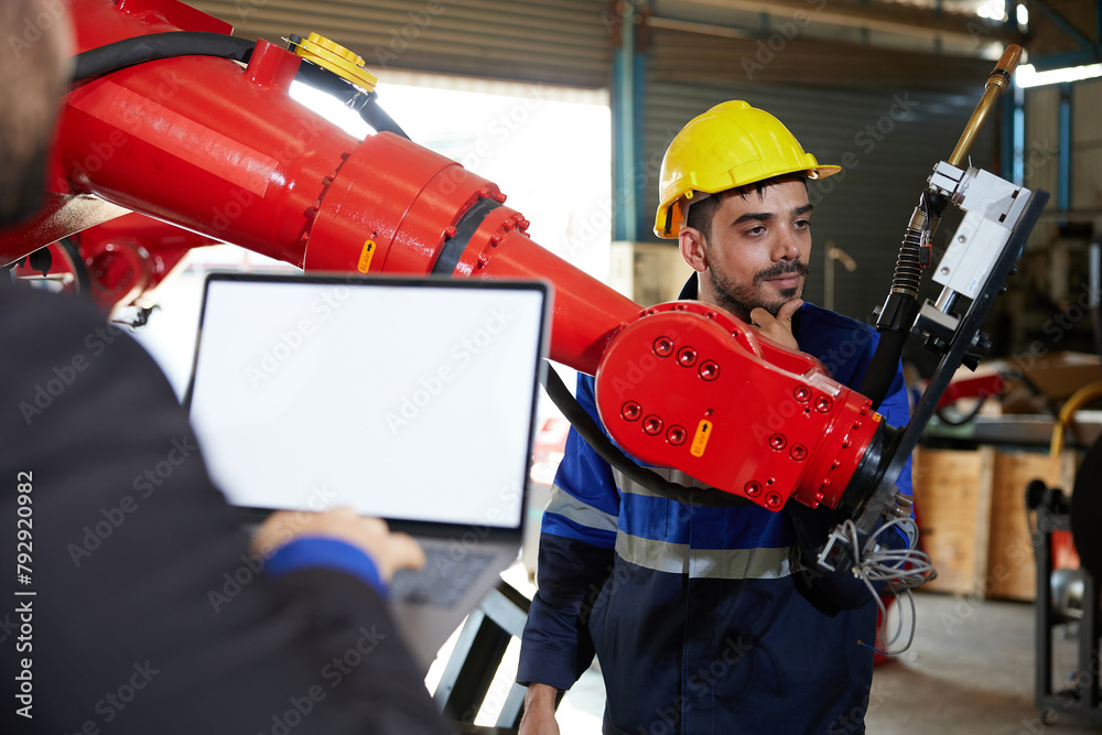 factory worker or engineer checking machine and boss using laptop computer for being observed in robot factory