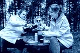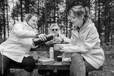 Halt for snack during hiking. Company hikers enjoying picnic on the bench, drinking hot tea, eating sandwiches in forest. Friends relaxing and having snack picnic on nature background. Backpacker trip