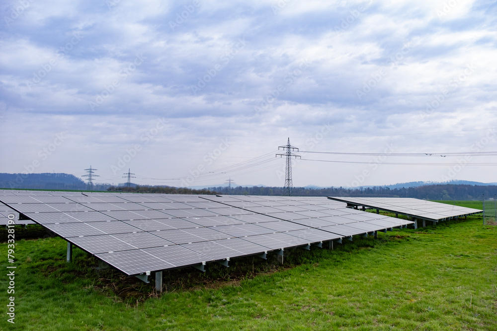 Rows photovoltaic panels stretch across solar farm, capturing sun's energy for sustainable future, Solar farms clean energy, generating electricity from sun's rays