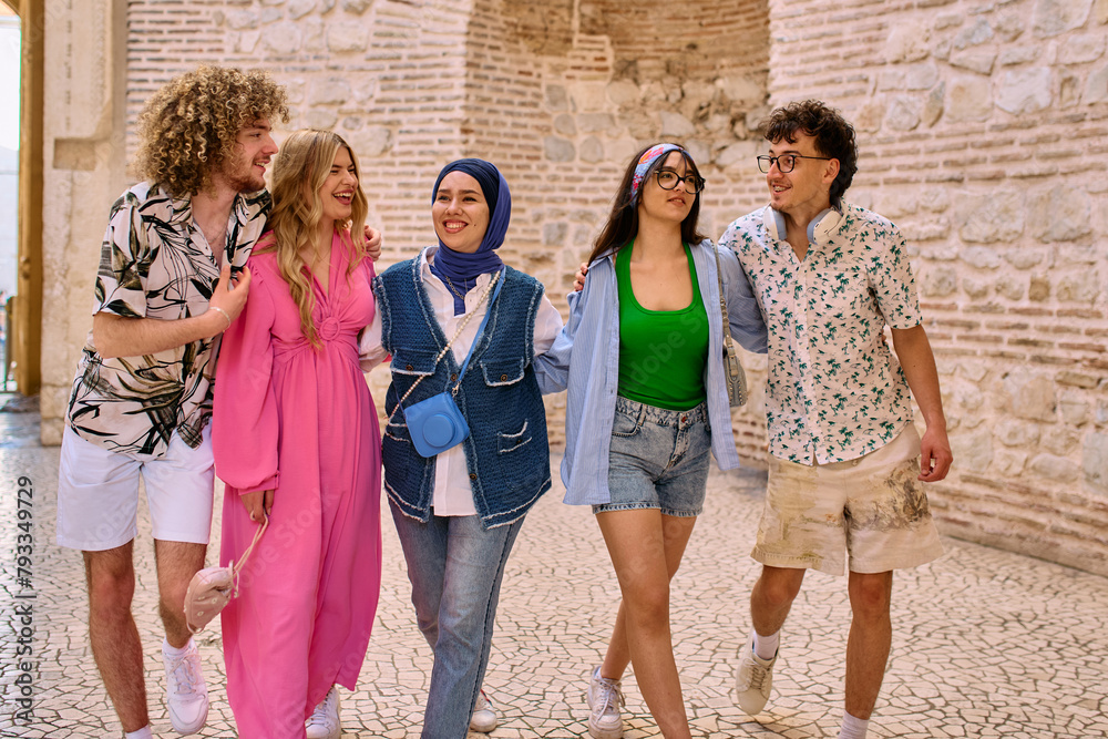 A diverse group of tourists, dressed in summer attire, strolls through the tourist city with wide smiles, enjoying their sightseeing adventure