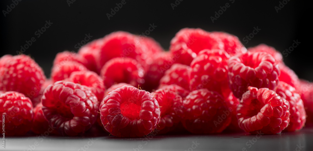 Raspberry fresh berries closeup, ripe fresh organic Raspberries over black background, macro shot. Harvest concept