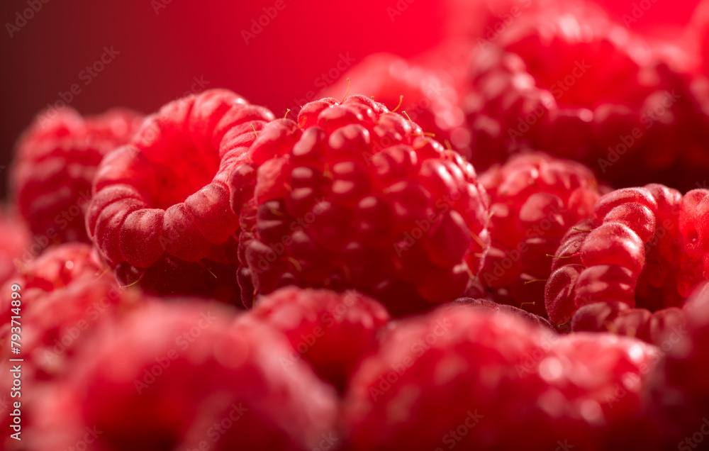 Raspberry fresh berries closeup, ripe fresh organic Raspberries over red background, macro shot. Harvest concept