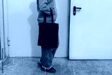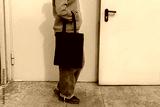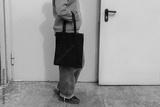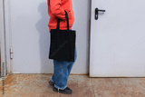 Woman in red hoodie holding tote canvas blank eco bag on street grey minimal wall background. Female consumer hold black textile shopper. template or place for your design, text, logo