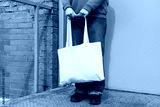 Woman in red hoodie holding tote canvas blank eco bag on street grey minimal wall background. Female consumer hold white textile shopper. template or place for your design, text, logo