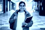 Books, portrait and study of student Indian girl on campus for learning at college or university. Bag, education and smile with happy academy pupil at school for development, knowledge or scholarship