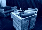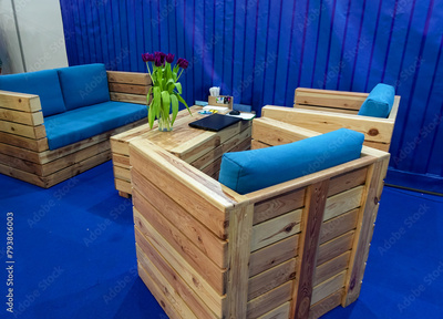 Wooden furniture from pallets in the office interior. Armchairs and coffee table on a blue background.