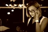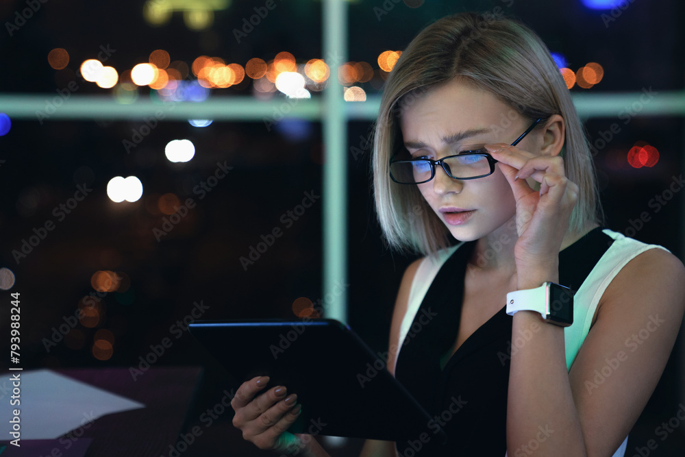 Close up of young businesswoman working on digital tablet in office. Beautiful female working late night in office sitting on a table with smartwatch on her hand