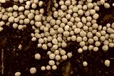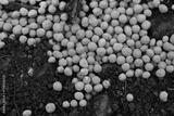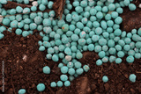 Close-up of blue chemical granular fertilizer on a agricultural field on springtime