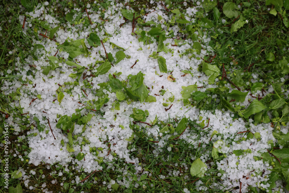 Close-up of damaged branches and green leaves with hailstones on green meadow