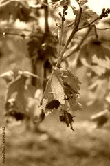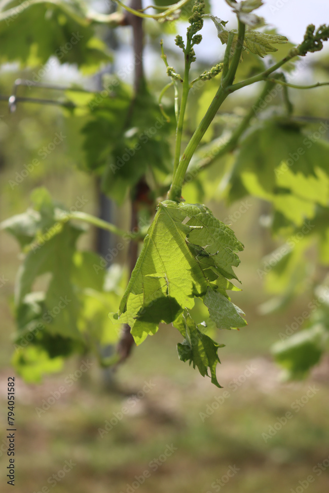 Close-up of vineyard with young fresh grapes and leaves damaged by hailstones on springtime. Hailstorm on vineyard in Italy