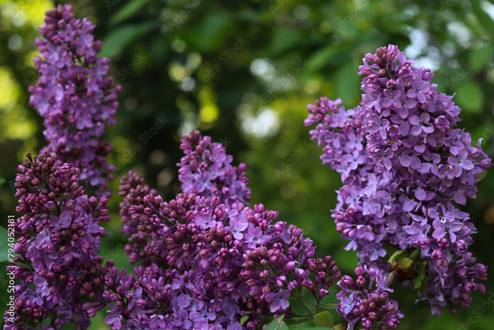 Close-up of Lilac pink blossoms and flowers on branches on springtime. Syringa vulgaris in bloom