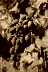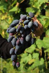 Close-up of old female hand holding ripe purple grape fruit on branches in the vineyard