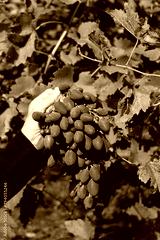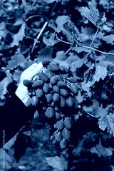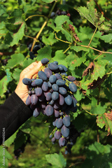 Close-up of old female hand holding ripe purple grape fruit on branches in the vineyard