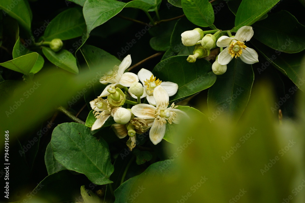 Close-up of grapefruit flowers blooming on a tree