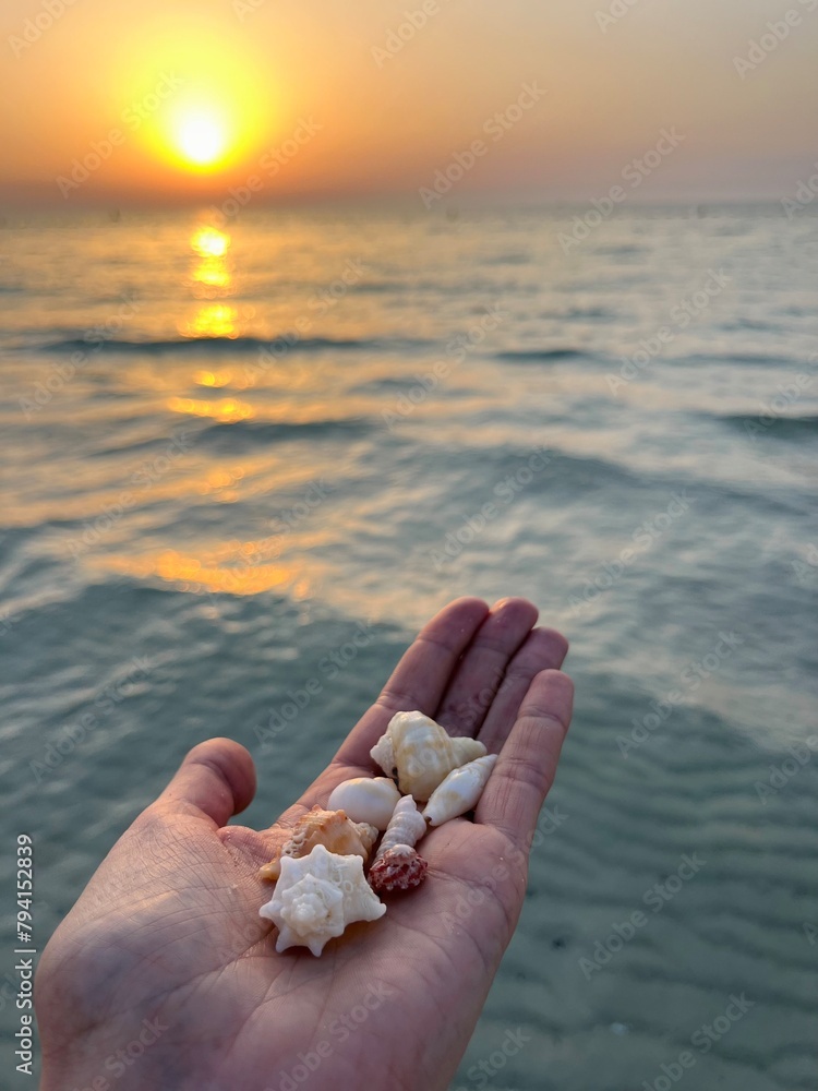 Tender seashells on the hand, sea sunset background, warm colors, cute small seashells