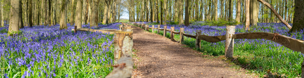 Beautiful spring panorama in a woodland forest with Bluebell carpet