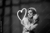 Woman Holding a Neon Heart and a Piggy Bank. Happy girl making amends between personal and professional live