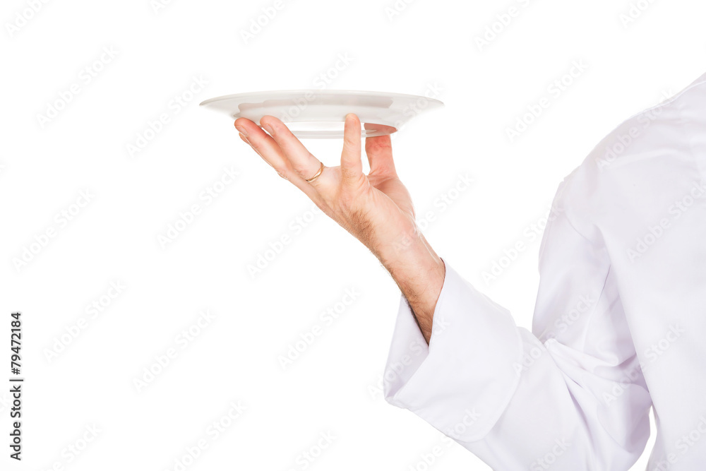 Chef's hand holding white porcelain plate