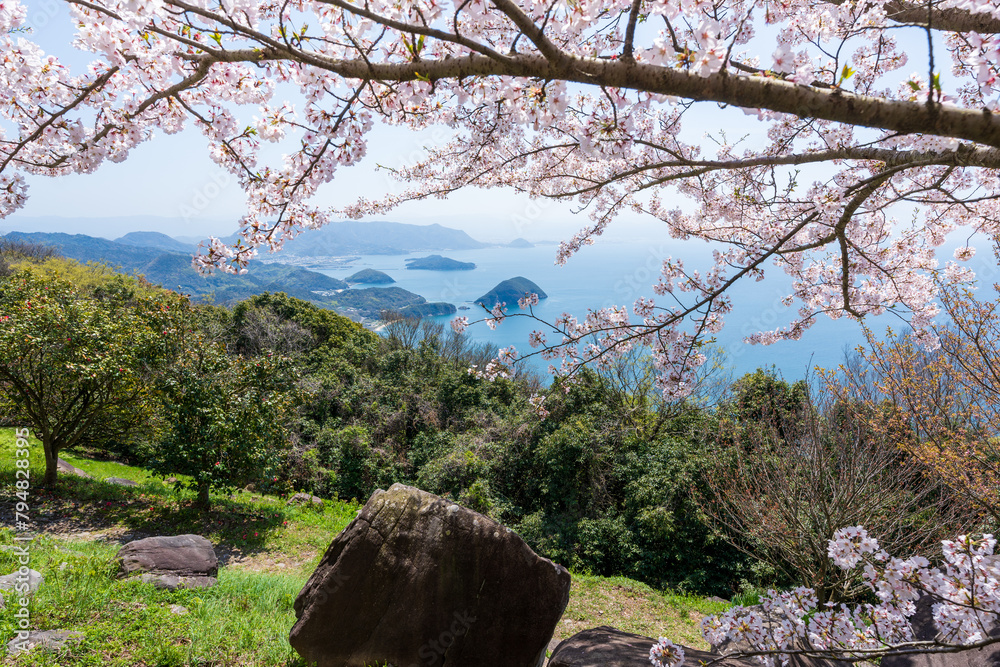 Mt. Shiude (Shiudeyama) mountaintop cherry blossoms full bloom in the spring. Shonai Peninsula, Mitoyo, Kagawa, Shikoku, Japan.