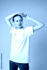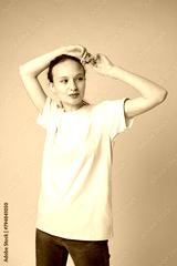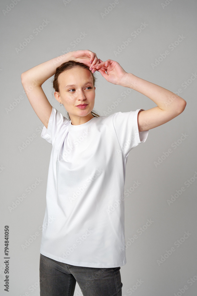 Beautiful young girl posing in white T-shirt and jeans on gray background