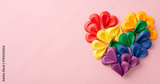 A vibrant display of colorful paper hearts in a rainbow formation, symbolizing love and diversity during Pride Month on a soft pink background