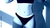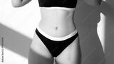 Unretouched skin, white slightly overweight young woman figure, curvy body in black underwear on studio minimal background. body positive concept, chubby girl. healthy plus size female belly and hips