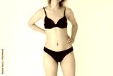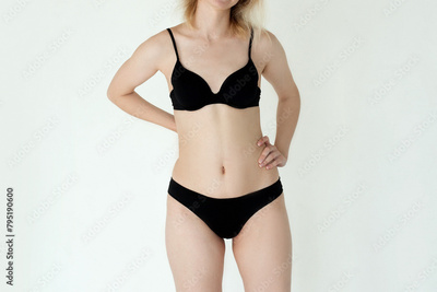Unretouched skinny white young woman, slim body in black underwear on studio white wall background, sunny day light with shadows. perfect body concept, sporty girl. fitness, healthy female