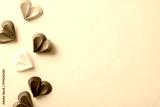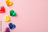 A creative display of multicolored paper hearts in red, yellow, green, and blue, symbolizing diversity and love, arranged on a soft pink background ideal for Pride Month