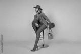 Glamour elegant woman is wearing an elegant fuchsia suit, hat and a pink handbag with spring flowers and is posingob blue background.