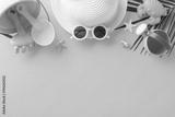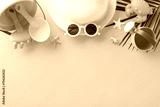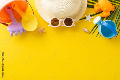 Bright and colorful summer beach accessories including a straw hat, sunglasses, and various children's beach toys laid out on a vivid yellow background