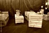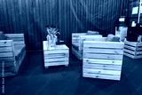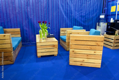 Wooden furniture from pallets in the office interior. Armchairs and coffee table on a blue background.