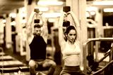 A sportswoman is doing triceps extensions with dumbbell with her gym buddy in a gym.
