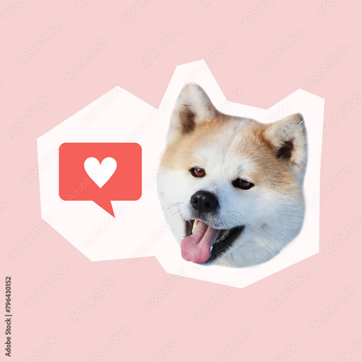 Surreal contemporary art collage in minimalistic magazine style, happy dog head with isolated like symbol. social media manager, influence marketing, positive blogger, selfcare, content creator, hype