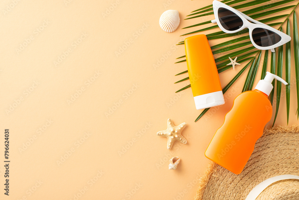 Beach accessories layout on beige background featuring sunblock, sunglasses, and palm leaves effectively communicating sun safety and vacation vibes