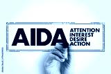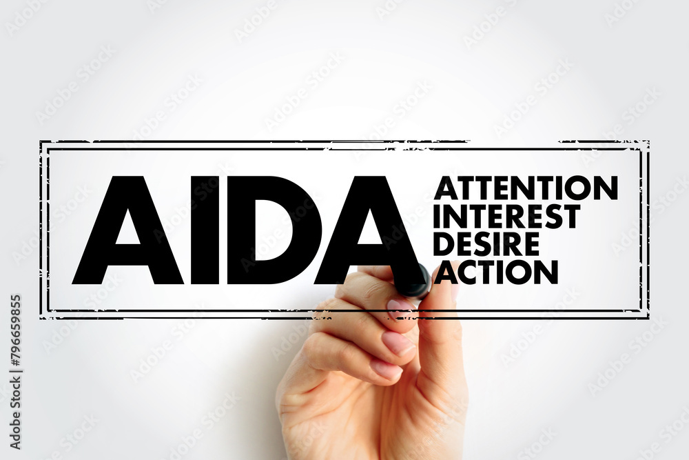 AIDA (marketing) Attention Interest Desire Action - one of a class of models known as hierarchy of effects models, acronym text concept stamp