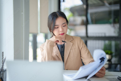 Businesswomen reading business document to thinking analysis strategy investment and management about new startup project while taking notes in paper and working with technology on digital laptop