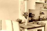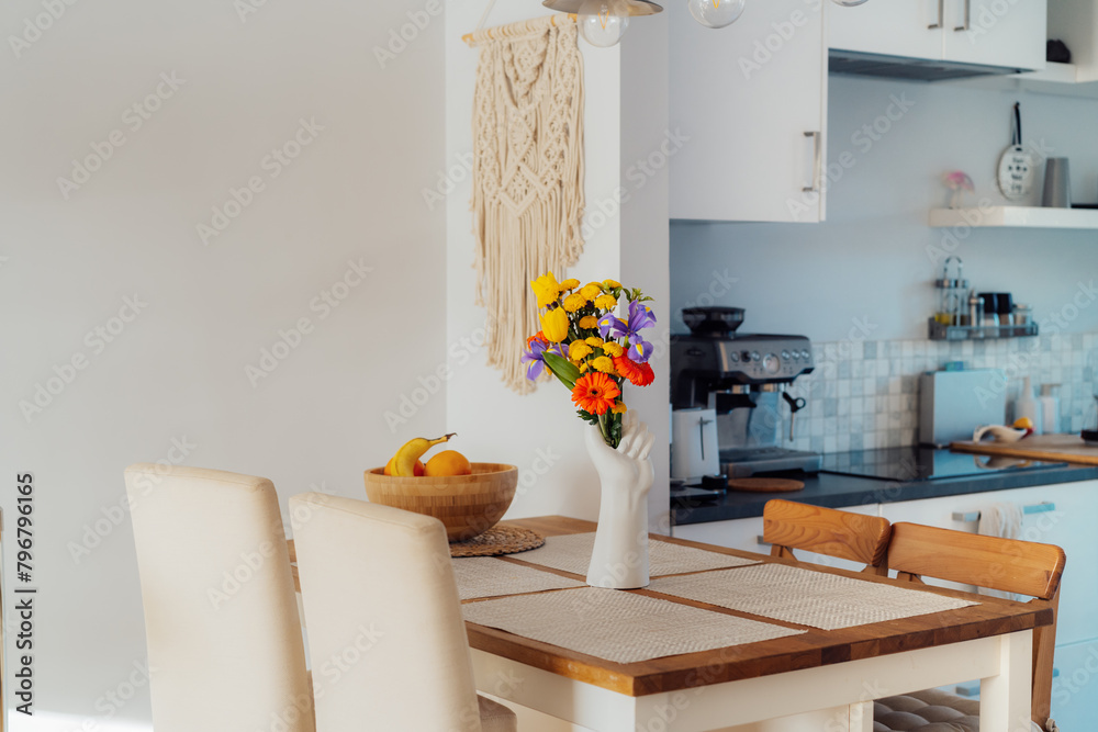 Kitchen counter table with focus on vase made in shape of human hand with multicolor various summer flower bouquet with blurred background of modern cozy white kitchen. Home interior design details.