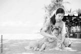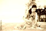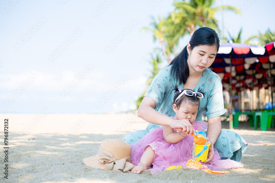 Mother and girl playing in the sand on the beach, Pattaya, Thailand,Mother with children playing with sand on beach