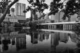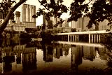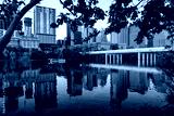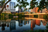 Golden hour in Austin, Texas. The cityscape reflected on the surface of Lady Bird Lake, accompanied by the gliding of a river boat tour. Perspective from the waterfront's edge during a summer evening.