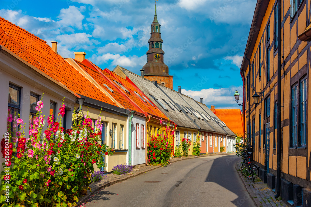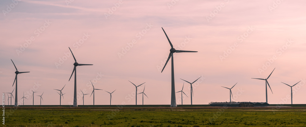 Panoramic views of many wind mills along the sea shore in the Netherlands.