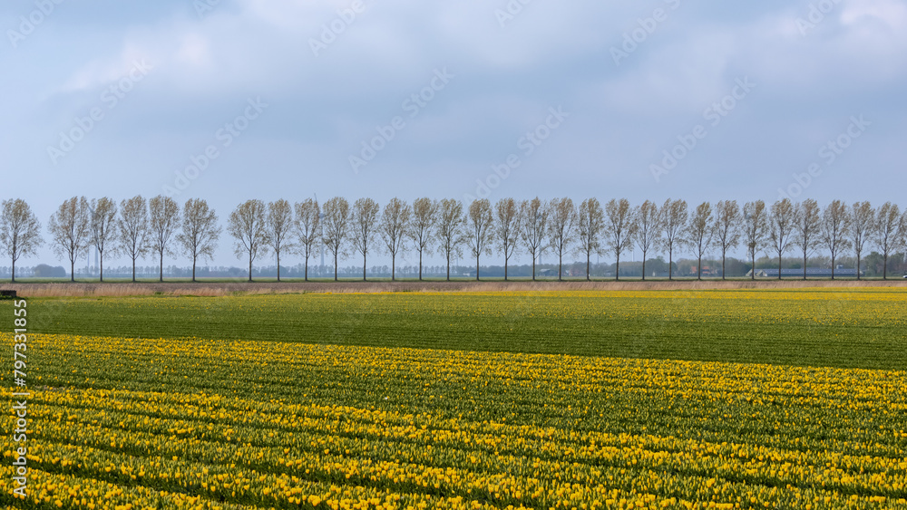 Netherlands countryside, Noordoostpolder area with row of trees along Tulip fields.