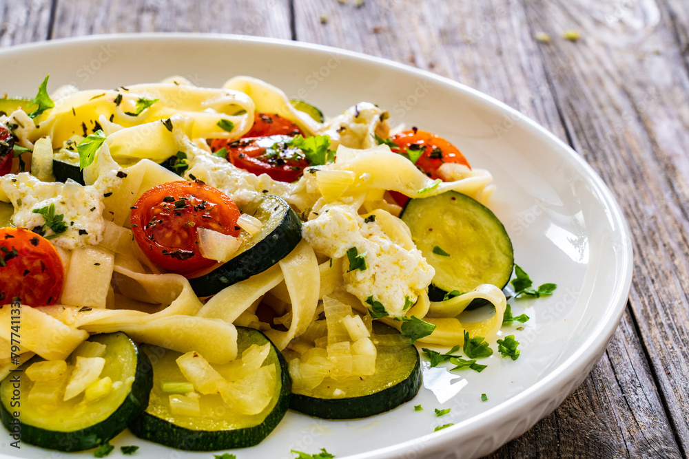 Pappardelle with parmesan, zucchini, tomato and cream sauce on wooden table