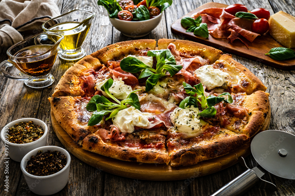 Circle prosciutto pizza with mascarpone cheese and leafy greens on wooden table