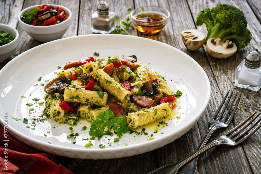 Rigatoni with sliced sausages, parmesan cheese and white mushrooms served on wooden table