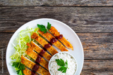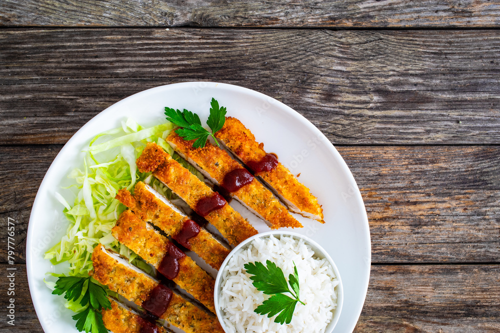 Tonkatsu - crispy Japanese pork chop with white rice and fresh vegetables on wooden table