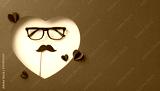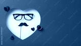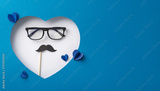 Creative Father's Day concept featuring a white heart with glasses and a mustache prop on a blue background, symbolizing parental love